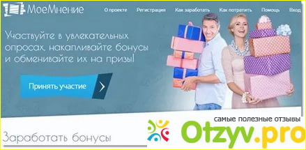 Как заработать здесь бонусы ? Просто! Это можно сделать следующими способами: 1) заполняете анкеты и опросы, за них начисляют от 5 до 50 бонусов; 2) проходить мини-анкеты от 5 до 15 бонусов; 3) приглашать друзей, за каждого зарегистрированного друга 30 бонусов; 4) совершать покупки в интернет-магазинах партнеров программы "Моё мнение"