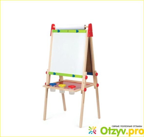 Мольберт магнитный Hape All-in-1 — это уже готовый мольберт для детского творчества, в комплект с которым уже идет рулон бумаги и баночки для краски.