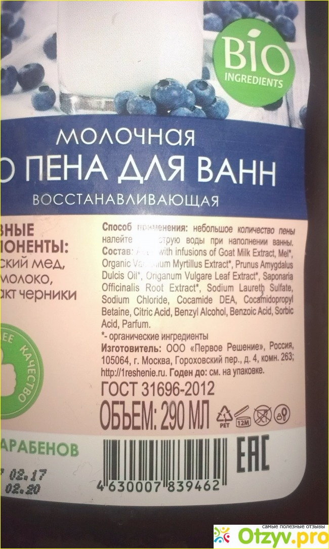 Итак представляю вашему вниманию молочную Bio пену для ванн восстанавливающая. Совершенно ничем не примечательный небольшой флакончик. Объём всего лишь 290 мл. Дизайна яркого и привлекательного нет совершенно, внимание не обратишь , если в глаза на полке магазина " не броситься". Изготовлено по Гост. Вся необходимая информация для потребителя находится на бумажной наклейке. Это не совсем удобно, так как наклейка просто размокает при попадании на неё воды и флакон имеет уже не презентабельный вид . Экономили на упаковке производители, но надеюсь не сэкономили на качестве содержимого.
