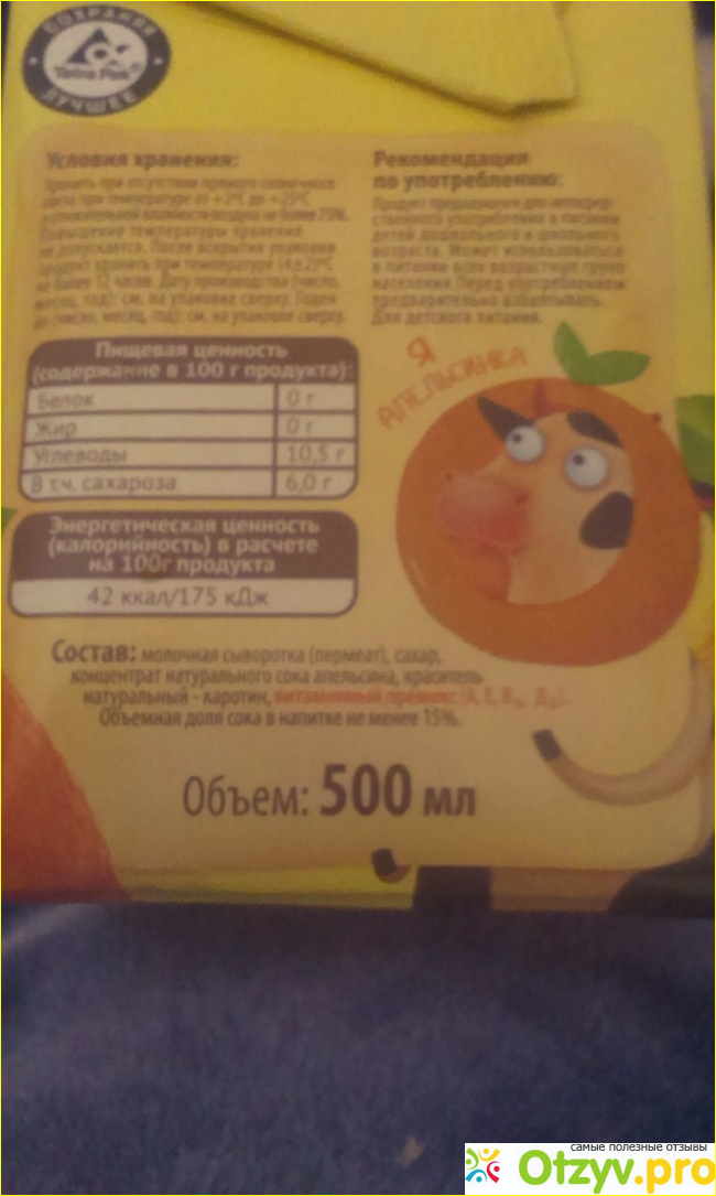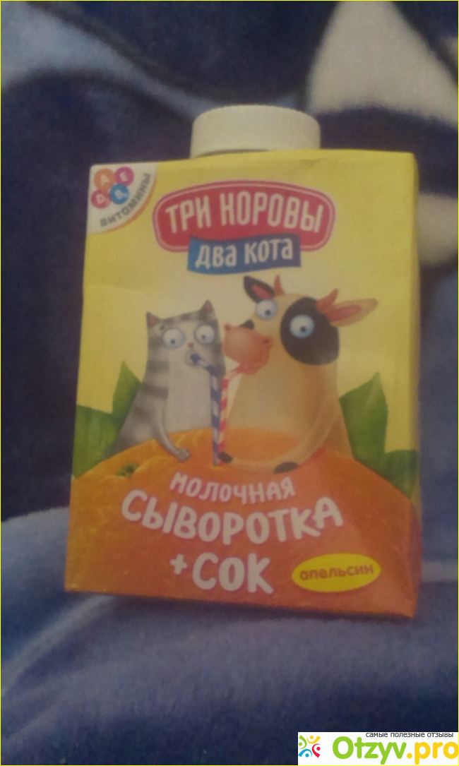 Молочная сыворотка + сок " Три коровы Два кота" вкус апельсин. Упаковка: Terra Pak, объём- 500 мл. Состав просто замечательный, ничего химического , не натурального и слишком вредного нет.