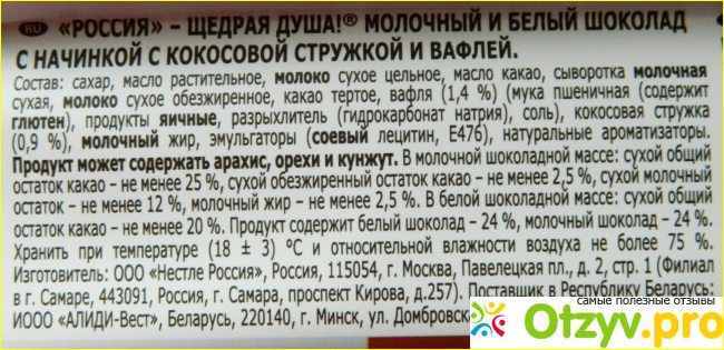 И вообще состав трудно назвать идеальным. Есть здесь растительное масло, мука - казалось бы чужеродные для шоколада. Но на вкус десерт неплохой. Но для меня - очень уж сладкий. Да и кокоса маловато. На фото видно эту тонкую прослойку.