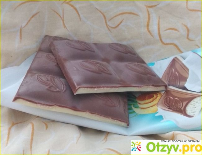 Надо сказать, что данный шоколад не твердый, он более мягкий и из-за этого его трудно ломать на дольки, оба слоя шоколада так и норовят расклеиться друг от друга, если хотите поломать на дольки, то плитку шоколада лучше сначала положить в холодильник или морозильник, чтобы она быстро остыла и стала твердой.