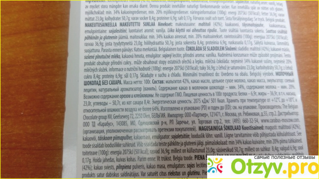 Главным достоинством этого шоколада является полное отсутствие сахара, а значит его можно кушать диабетикам и людям, которые придерживаются низкокалорийной диеты. Вместо сахара производитель использовал качественный сахарозаменитель мальтитол, который полностью безопасный.
