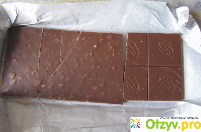 Вот досада: плитка настолько тонкая, что малейшее падение может привести к тому, что она раскрошится. Так и случилось. Ну ладно. В коробочке практически невозможно прощупать. Плитка поделена на весьма приличные по размеру дольки, на которых изображение какао. Фундук в шоколадке сильно измельчен.