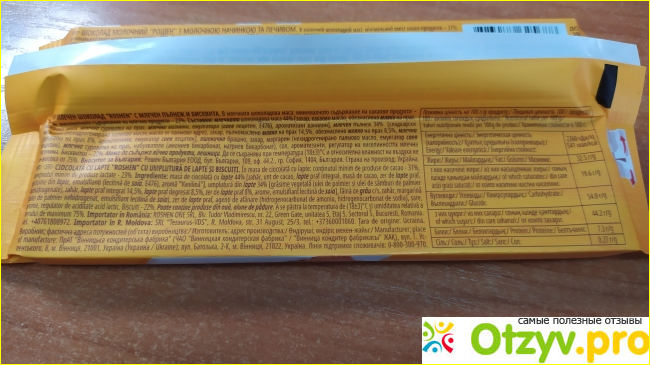 К составу у меня есть претензии, он не идеальный, но очень уж вкусное это лакомство, поэтому выискивать минусы не стану. Скажу только, что в шоколаде есть растительный жир и ароматизатор, а печенье содержит разрыхлитель, но это не самые страшные ингредиенты.