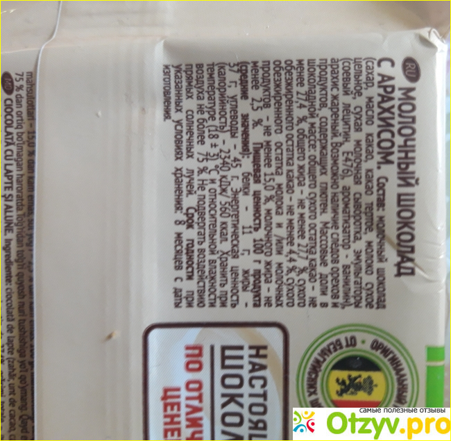В составе нет вредностей: лишние ароматизаторы, красители и консерванты. Шоколад с жареным арахисом. Арахиса очень много. В сочетании получается вкусно. Шоколад просто тает во рту. Если руки горячие. то тает прям в руках. Очень нежный. На вкус сладкий, без горечи. Люблю такой шоколад к чаю или кофе и вам советую не проходить мимо.