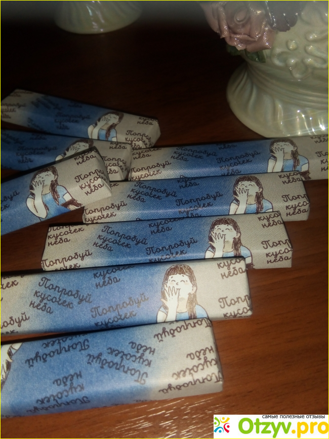 Дизайн упаковки выполнен в небесно голубой цветовой гамме, а на каждой отдельной шоколадочке рефреном нарисована надпись - попробуй кусочек неба.