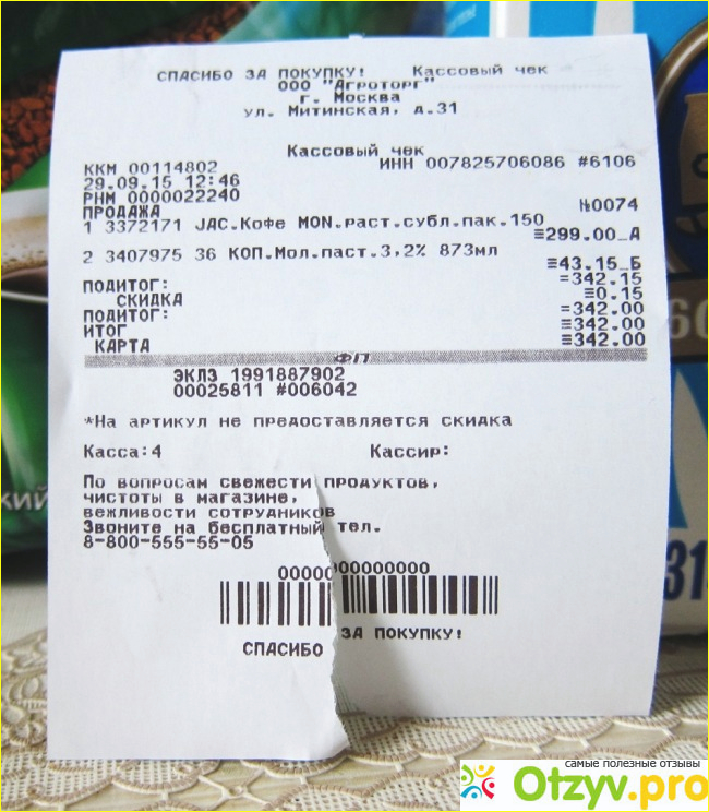Можно предположить, что это предприятие существует давно и когда-то в советское время оно так же производило молоко. А цены ведь тогда были фиксированными по всей стране. И вероятно молоко этого предприятия стоило именно тридцать шесть копеек. Конечно, сегодня у него совсем другой ценник. И это даже не тридцать шесть рублей. Если верить кассовому чеку, полученному мною в соседней "Пятёрочке", пакет такого молока обходится нам в сорок три рубля пятнадцать копеек: