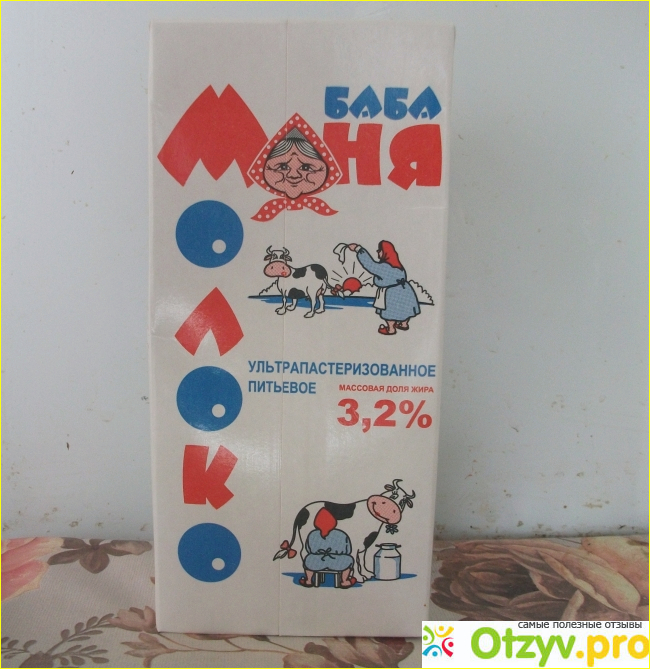 В магазинчике около дома привлекла внимание упаковка молока "Баба Маня". Стандартная литровая упаковка, так называемый тетрапак с забавными рисунками. Жирность, (МДЖ, массовая доля жира) - нормальная для этого продукта, 3,2 %.