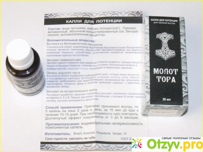 Перед покупкой, мы с мужем прочитали множество отзывов на различных форумах. И очень многие из них были хвалебными, в которых утверждалось, что средство отлично действует и на сто процентов способно вернуть мужчине его мужскую силу, избавив от проблем с потенцией. Эффективность препарата «Молот Тора» объясняется его совершенным составом, который не только не вызывает противопоказаний, но даже помимо восстановления потенции служит для общего укрепления и оздоровления мужского организма. В своем составе капли включают такие натуральные компоненты: