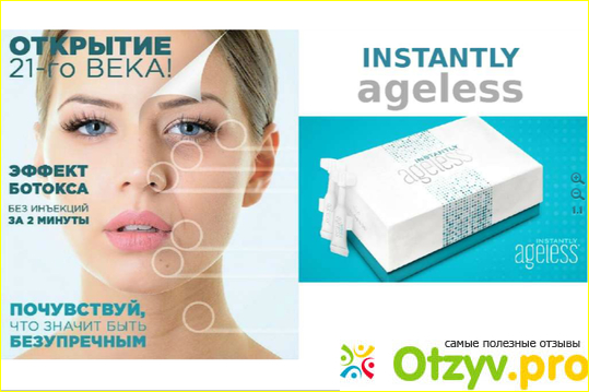 Крем instantly ageless, сегодня достаточно востребован, поскольку обладает невероятными качествами и свойствами. Это крем который помогает коже омолаживаться за короткие сроки, благодаря своему составу и специально разработанной технологии производства средства. В его состав входят все безопасные компоненты, которые эффективно устраняют морщины, не оставляя от них никакого следа. При этом, данный крем не вызывает аллергических реакций, а напротив имеет еще и увлажняющий эффект, поэтому способен не только омолаживать кожу, но так жее и увлажнять и избавлять от сильной сухости. Крем был многократно тестирован дерматологами, многократно испытан, поэтому он считается максимально безопасным для человека и его кожи.