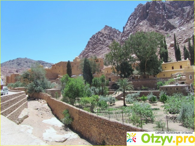 Монастырь производит впечатление суровой неприступной крепости с толстыми высокими стенами (подпертые контр-форсами) и крепкими воротами. Кроме того, у монахов есть огромное хозяйство (фруктовый сад и оливковая роща) и отель (кельи) для паломников, судя по растущим эвкалиптам (которые очень любят воду), монастырь прекрасно обеспечен источниками с водой. Для паломников открыта очень небольшая часть монастыря, но вы сможете посетить иконную лавку, сфотографировать Неопалимую купину и оставить в Базилике Преображения записочки с просьбами о здравии (правда записочки имеют право подавать только православные).