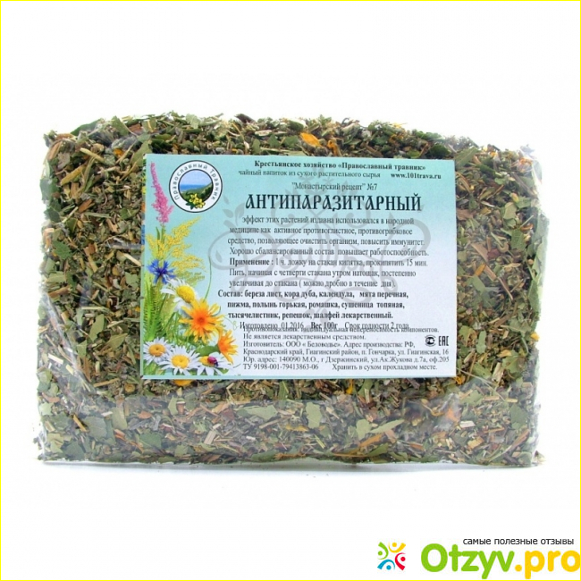 Как правило чай продается в небольшой упаковке. Этот чай представляет собой сбор из нескольких лекарственных трав. И все эти травы как раз направлены на очищение организма от паразитов. Причем комплекс подобран таким образом, что лечебное действие оказывает не какой-то конкретный компонент, а их комплексное действие. Так как каждый компонент увиливает действие другого.