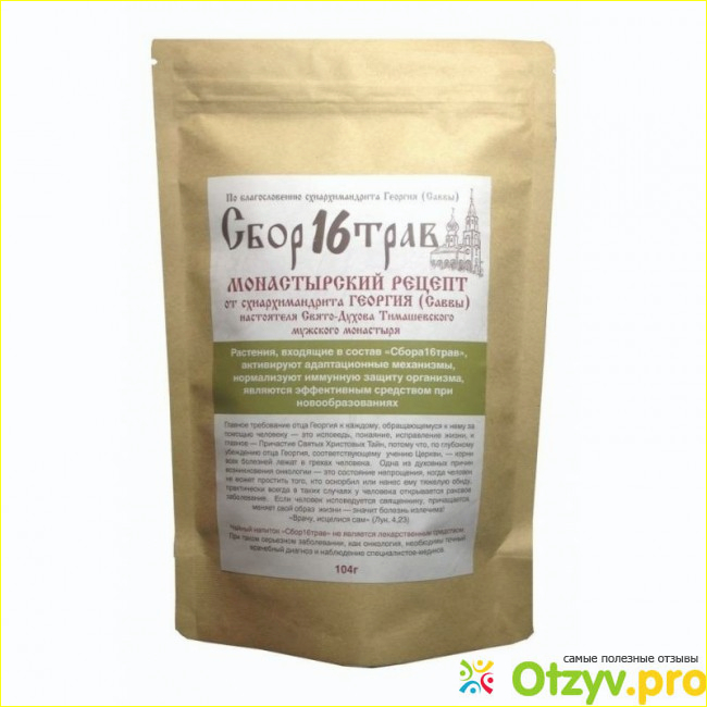 Все народные рецепты исходят от наших предков. Большинство таких рецептов содержат известные растения и листья. Да да именно растения и травы являются главными целителями всех болезней. И вот наши предки собирали эти травы, сушили их и потом готовили из них чудо средства. Они могли помочь при кашле или боли в горле, но все таки такие опасные заболевания как рак, растения к сожалению излечит не могут. Но все же и некоторые специалисты, то есть врачи и сами иногда рекомендуют пить какую- нибудь настойку из трав, говоря что они даже эффективней будут чем лекарства. Так вот я хочу рассказать о таком чудо сборе как Монастырский сбор отца Георгия шестнадцать трав.