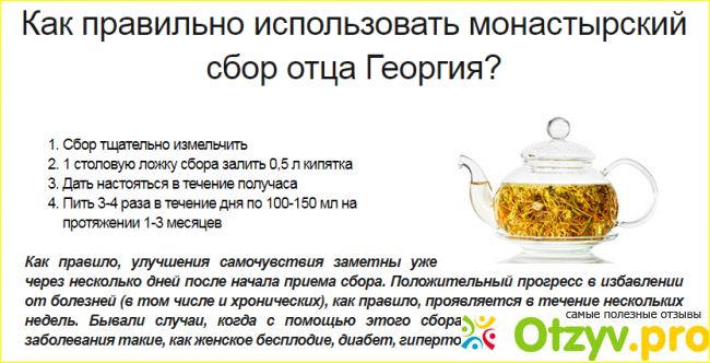 Монастырский сбор основан на шестнадцати травах. Он используется при очень широком спектре заболеваний. И положительно влияет на работу всего организма. Укрепляет защитные силы, дает энергию, чистит почки и печень, и другие органы. Сбор отца Георгия чистит кровь, улучшает обмен веществ. Помогает и при депрессии, неврозах, бессоннице. В общем, как и многие знаменитые средства лечит все кроме смерти. У производителя чая есть даже информация о том, что он избавляет от онкологии. Заваривать сбор очень просто - 1 чайная ложка сухого сырья на 1 стакан кипятка. Отвар готовят в открытой посуде. И принимают четырежды в день по одной столовой ложке.