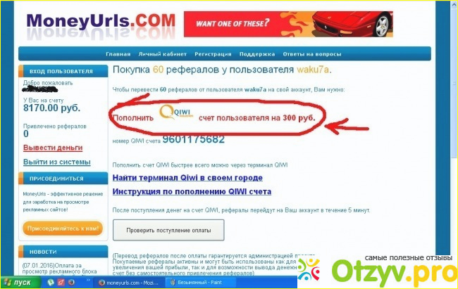 дополнительный заработок. На этой же страничке снизу появилась надпись о том, что можно купить рефералов используя биржу сайта. И естественно, заработаные здесь деньги нельзя использовать для покупки. А нужно на номер QIWI счета указанного пользователя перевести деньги через терминал QIWI. Следующим шагом было поискать отзывы о сайте. На это ушло немножко времени, так как их было очень мало. Больше вопросов чем ответов. Но все таки нашла что искала. Люди вложившие деньги на рефералов, как правило,