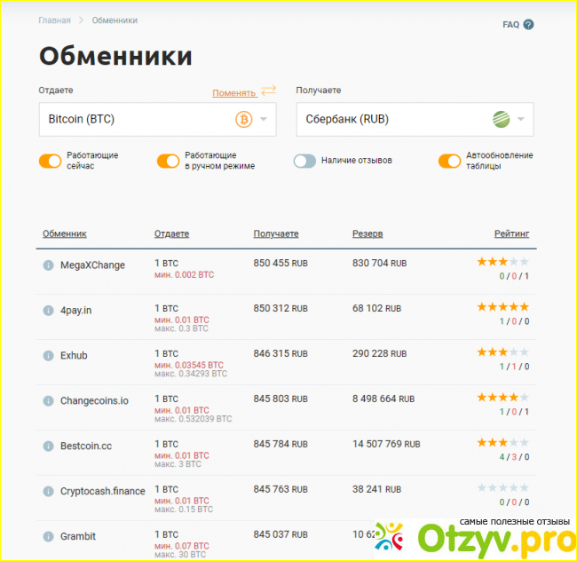 Достоинства: актуальная информация, большая база обменных сервисов, большой функционал фильтров и сортировок, возможность просмотра отзывов и рейтинга