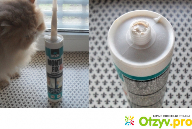 Всем хорош этот клей, только очень густой и выдавливается из тюбика с трудом. У меня нет специального "пистолета" поэтому использую его без "родной" насадки. Просто насаживаю тюбик на рукоятку молотка, упор в пол и выдавливаю "колбаску" нужной длины.