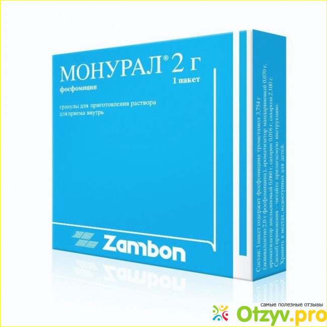 В такой коробке находится один пакет с порошком. Фасовка бывает двух видов: 2 гр и 3 гр. С выбором должен определить врач. Действующее вещество у Монурала - это Фосфомицин.