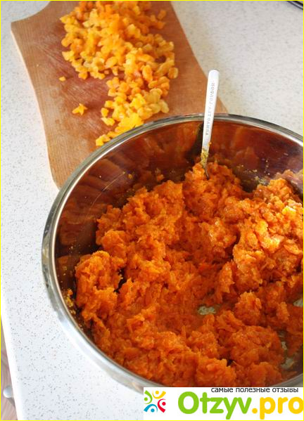 Немного поразмыслила и выбрала следующие составляющие: один килограмм морковки, натертой на мелко терке, одно зеленое кислое яблоко, натертое на крупной терке и пол стакана молока (все это кладу в емкость и тушу до готовности на маленьком огне после предварительного перемешивания), затем добавляю две столовые ложки манки, щепотку корицы (молотой), сто граммов распаренной крупной кураги, нарезанной мелкими кусочками и одно яйцо (домашнее) - все это перемешиваю до однородной массы.