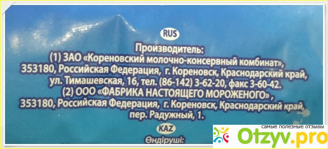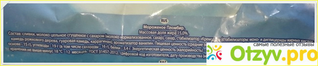 Изготовлено такое мороженое по ГОСТу, причём из натуральных сливок. Массовая доля жирности в нём составляет 15 процентов. Большие пакеты с мороженым удобны тем, что их можно хранить в домашних условиях, в морозильной камере и в любой момент угостить и гостей, и детей, и покушать самим. К тому же, порцию можно выбрать на своё усмотрение. Десерт этот Российского производства, изготавливается в городе Кореновске, что Краснодарском крае.