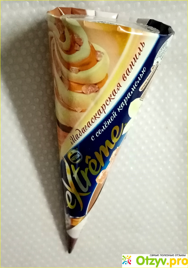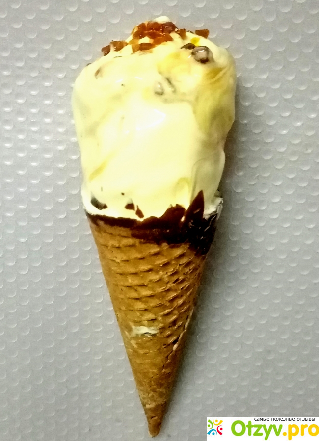 ожок вафельный, хрустящий. По краю рожка немного шоколадной глазури. На самом верху, поверх сливочного мороженого, карамель. Я бы не сказала, что вкус солоноватый, нет. Вкус карамели есть, ваниль тоже ощущается.