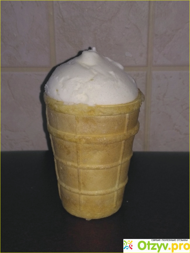 Мороженое белого цвета в вафельном стаканчике имеет легкий аромат нежной ванили. Тает во рту, оставляя привкус свежайших воздушных сливок. Эдакое снежное лакомство.