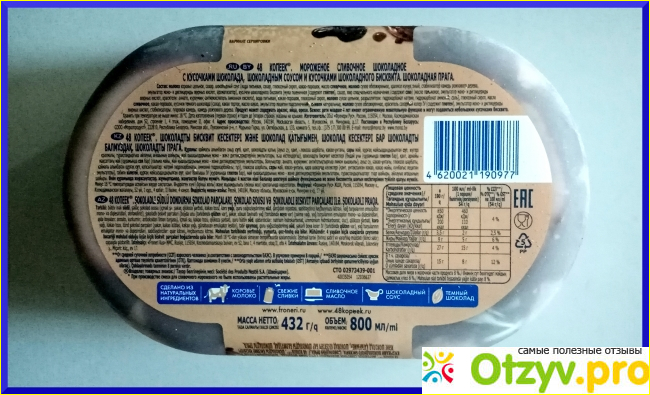 Снизу ванночки много информации. В составе на первом месте молоко коровье цельное. Потом идут сахар и шоколадный соус. Состав не идеален. Вес НЕТТО 432 грамма.