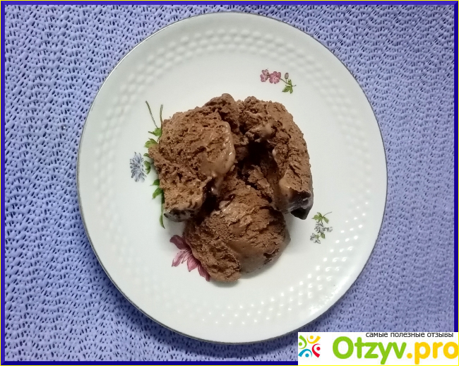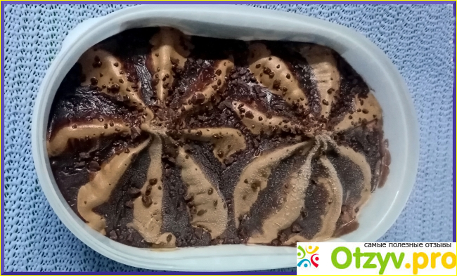 Выглядит мороженое очень аппетитно, сверху шоколадная крошка в шоколадном сиропе.