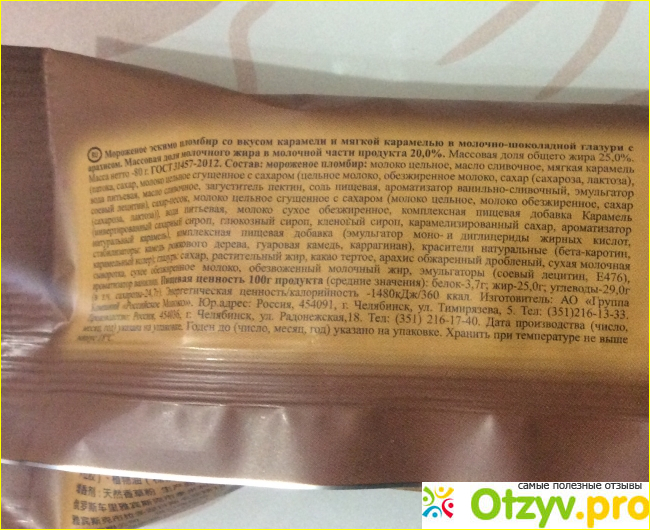 На упаковке написана вся необходимая информация, которая может прерваться потребителю при покупке мороженого. Производитель оставил информацию о своих контактных данных, весе мороженого и составе.