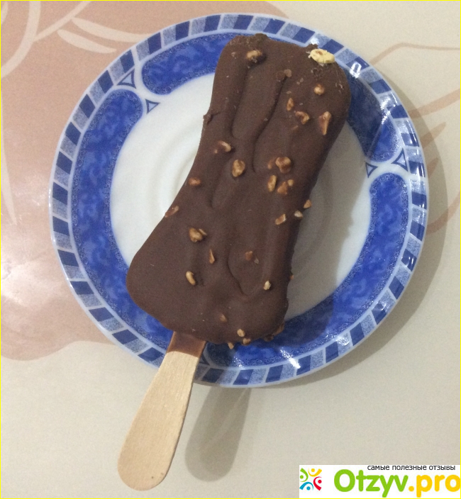 Открыв упаковку с перед глазами сразу предстает симпатичный пломбир. Мороженое держится на деревянной широкой, удобной, без зазубрин и качественной палочке. Сама мороженка представляет собой аккуратную форму, видно что пломбир обильно полит шоколадом, а шоколад свою очередь посыпан крупными орешками.
