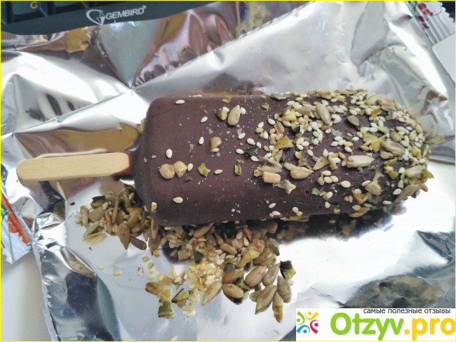 Пломбир покрыт шоколадной глазурью - это всегда вкусно. Кроме того, глазурь присыпана тыквенными семечками и кунжутом. Возможно именно их легкая горчинка нивелирует излишнюю сладость сгущенки. В целом - очень достойный продукт.