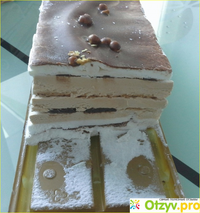Это мороженое, на мой взгляд, больше похоже на торт. Состоит из двух слоев собственно мороженого: белого ванильного и шоколадного или карамельного ( на вкус не очень понятно, но вкусно). Между слоями мороженого прослойки затвердевшего шоколада. И еще добавлены мелкие кусочки грецкого ореха, на упаковке он значится как карамелизированный. Есть это "Торжество" лучше после того, как оно чуть подтает. Тогда больше ощущается контраст мягкого мороженого, ломающегося тоненького слоя шоколада и попадающихся кусочков ореха. Объедение просто.