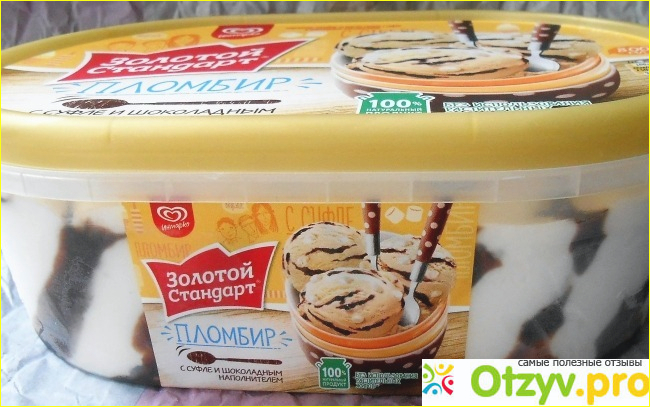 Продается мороженое Золотой стандарт "Пломбир" с суфле и шоколадным наполнителем в пластиковой, овальной баночке. Баночка очень прочная, кстати, сойдет что-нибудь замороженное в морозильной камере хранить, ягоды например. Баночка у этого мороженого имеет яркое цветовое оформление, в желтом цвете сделана. И очень аппетитная картинка изображена - шарики мороженого в стакане, глядя на эту картинку, сразу хочется мороженого.