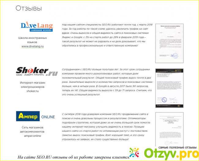 Дело вот в чем. Если клиент соглашается дать оценку, отзыв на сайте выходит с названием компании, печатью, именем должностного лица. Обладающий такими атрибутами отзыв — настоящий. Посмотрите, к примеру, отзывы о сео. ру: по оформлению отзывов уже понятно, что они не то что не безликие — они официальные. Это точно не мошенничество:
