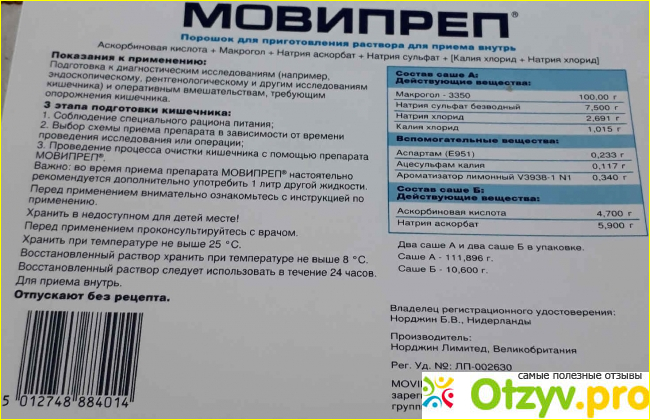 Мовипреп - осмотическое слабительное средство, предназначенное для очищения толстой кишки в качестве подготовки к колоноскопии у взрослых. Полиэтиленгликоль с электролитом используется для очистки кишечника перед определенными процедурами обследования кишечника, такими как колоноскопия или рентгеновская клизма с барием. Это слабительное средство, которое втягивает большое количество воды в толстую кишку.