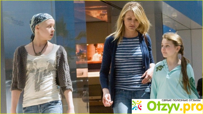 Но столкновения не происходит. Точнее, оно плавно уводится на второй план и растворяется в ткани фильма. Вместо первого конфликта мы внезапно получаем второй, и оказывается, что дело совсем не в Анне, а в её с Кейт матери. Я не поклонница Кэмерон Диас, но роль маниакально упёртой героини ей подошла как нельзя лучше. В своей борьбе за первую дочь героиня забывает о второй, забывает вообще обо всём. Это вызвало уважение в сцене, когда она побрилась налысо, но чаще выглядело отталкивающе, и совершенно очевидно, что Анна для Сары — в большей степени средство достижения цели, чем родной человек.