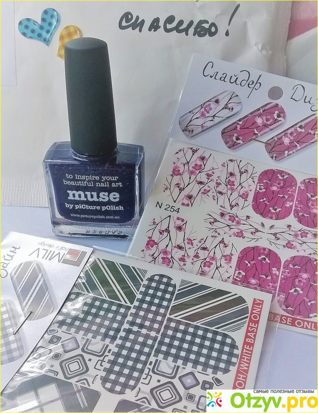 Свой первый заказ я сделала в интернет-магазине месяц назад. С 20-ти процентной скидкой мне удалось взять снятый с продаже в Австралии, но еще присутствующий в ЛакоДоме Picture Polish Muse. В подарок мне положили 2 слайдер-дизайна Milv, а на конверте каллиграфическим почерком, обратившись по имени, написали "Спасибо!". Это очень мило и приятно! А пикчер "Муза" оправдал все надежды, ведь я колебалась долгое время: покупать - не покупать. Он очень красивого фиолетового цвета с отчетливой голографией.