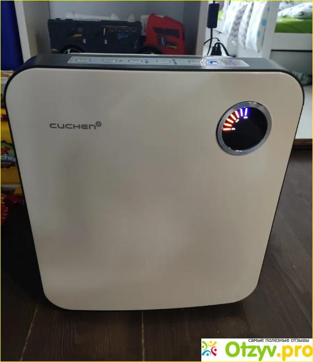 И так, мойка воздуха Cuchen Airwash, корейского производства. Вполне симпатичная, мне кажется впишется в любой интерьер. Не громоздкая. В обслуживании довольно простая: вода подходит неочищенная, т. е можно заливать воду прямо из под крана, бака объемом 5 литров хватает на сутки, т. е всего раз в день происходит долив воды. Чистка мойки несложная, разбирается она легко. Требуется пропылесосить угольный фильтр и помыть чашу, где вращается барабан. Кстати, не смотря на частую уборку дома, грязи она все равно достаточно всасывает. И пыль теперь скапливается гораздо медленнее. Мойка имеет несколько режимов, но у нас чаще всего стоит на АВТО режиме, этого вполне достаточно для комфортной влажности 50-60%.