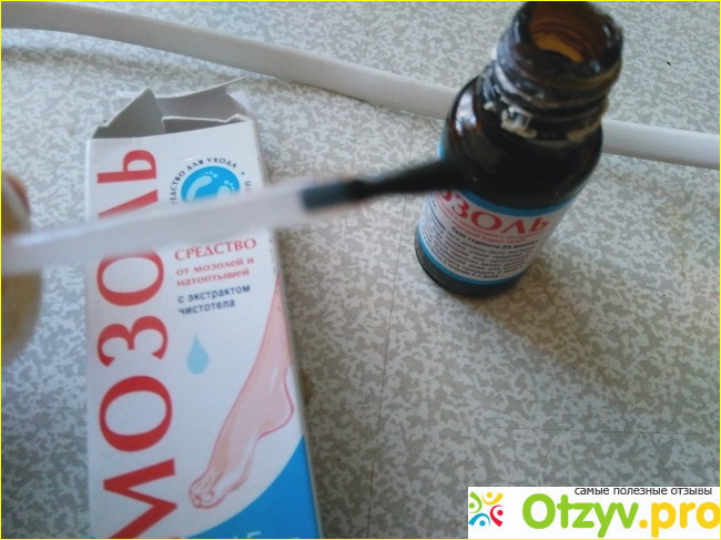 "Мозоль" - жидкое, напоминающее по консистенции клей, средство. Продается в темном стеклянном флаконе, к крышечке прикреплена кисточка для удобства нанесения клейкой массы на мозоли и натоптыши.