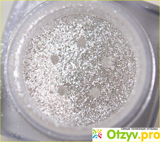 Если взглянуть на миниатюрную баночку с бриллиантовой крошкой - не знаю как кто, а я влюбилась с первого взгляда (очень люблю красочную упаковку). Под крышечкой дополнительная углубленная мембрана с пятью дырочками, чтобы добыть необходимое количество струящегося материала достаточно встряхнуть баночку, а потом кисочкой взять немного жемчужного микса.