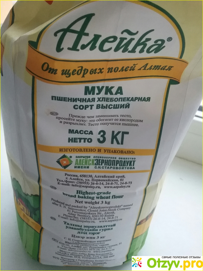 В своем городе обычно я покупаю муку другого производителя. В упаковке расфасовано 3 кг муки. Изготовлена и упакована мука пшеничная хлебопекарная "Алейка" высшего сорта ЗАО "Алейск зернопродукт" имени С. Н. Старовойтова.