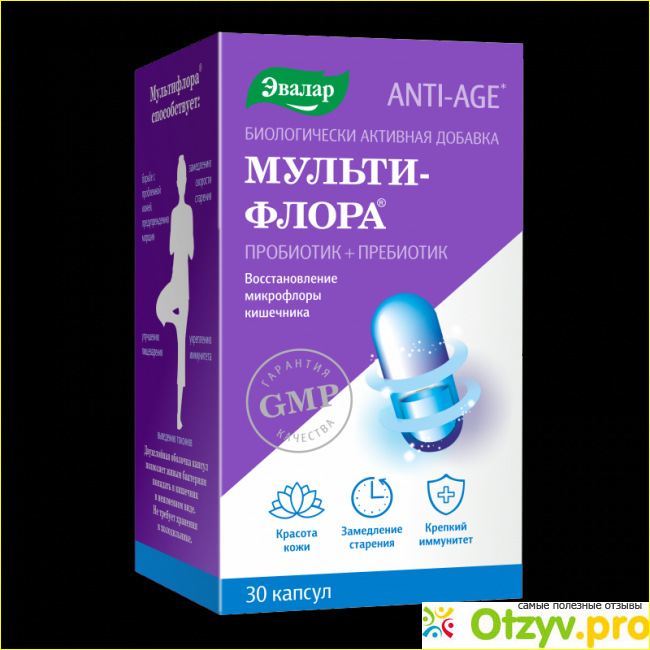 Мультифлора эвалар способствует восстановлению микрофлоры кишечника и росту полезной микрофлоры в нем, а также укреплению иммунитета. Цена препарата по сравнению с аналогами меньше почти в два раза. При этом действие очень хорошее. Заметила, что после пройденного курса - исчезли прыщи с кожи лица и спины - видимо хороший детокс для организма. Кстати, можно детям с 3х лет.
