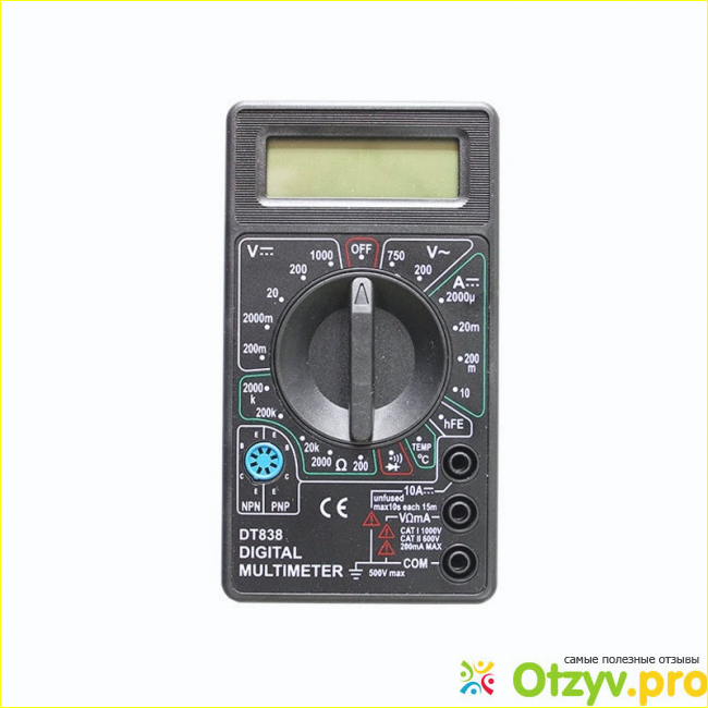 Цифровой мультиметр DT-838 имеет жидко-кристаллический дисплей, на котором отображается вся необходимая информация. Также имеется индикатор заряда батареи. В приборе имеется переключатель на 20 режимов для измерения различных электрических параметров. В мультиметре имеется защита от перегрузок.