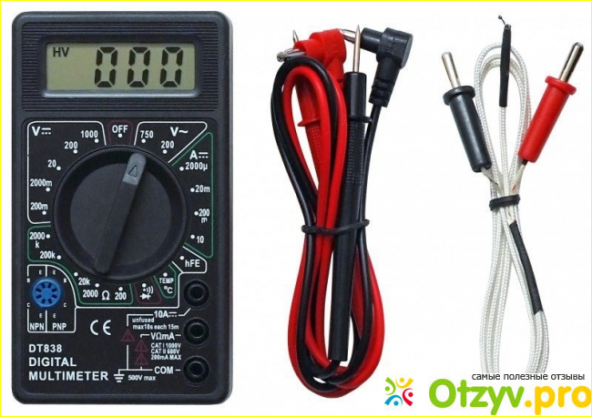 В мультиметре DT-838 есть возможность измерения температуры и отдельные провода. При этом, измерение температуры данным мультиметром довольно точное. Мы проводили тестирование с обычным комнатным термометром и погрешность составила всего один градус. Это довольно неплохой результат для такого дешевого мультиметра.