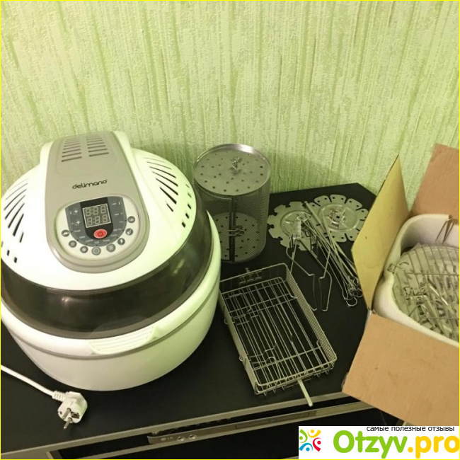 Высота: тридцать один сантиметр, мощность до одной тысячи пятьсот ватт, диаметр двадцать шесть сантиметров (самый оптимальный, как по мне), антипригарное покрытие, вес: четыре килограмма и четыреста десять граммов. Внутри две нагревательные пластины и вентилятор, благодаря которому циркулирует воздух.