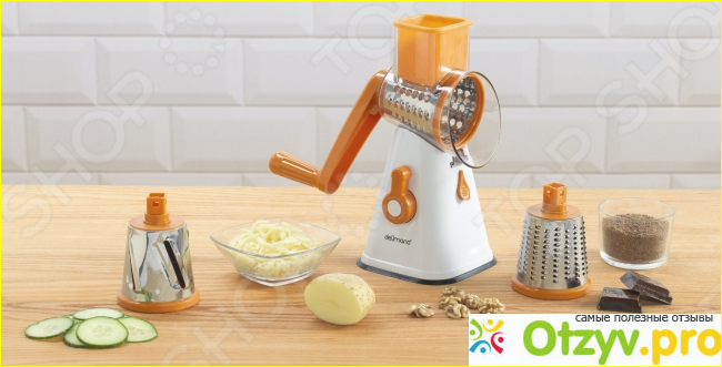 Данная модель терки является чисто китайским товаров. Кстати, производитель Delimano выпустил в продажу сразу несколько вариантов подобных терок. Они очень похожи по принципу действия, но отличаются по своей цене и количеству насадок.