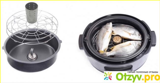 К слову сказать, наш герой отзыва является универсальным устройством, так как он не только варит, жарит, готовит на пару, делает йогурты и тому подобное, но также коптит. Как коптильня она действует в трех вариациях: холодное, горячее и комбинированное копчение. Для того, чтобы приготовить блюда с дымком, здесь точно также применяется насадка ТЭН в которую всыпается щепка. Для большего удобства предусмотрена трехъярусная решетка, чтобы больше продуктов влезло.