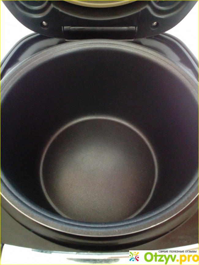 Внутренняя чаша довольно вместительная – 4,5 литра. Тефалевое покрытие за время использования не потрескалось и «не слезло» с поверхности. В этом есть, конечно, и моя заслуга, так как пользуюсь я только специальными ложками, которые были в комплекте (плоской и столовой) и чищу кастрюлю очень аккуратно мягкой губкой без абразивных средств.