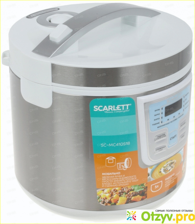 Данная модель привлекла наше внимание своим брендом и ценой. Фирма скарлет уже давно на рынке и трудно встретить плохих отзывов о ней. Есть удобная функция отложенной готовки, вплоть до 24 часов можно отложить. Например если хочешь чтобы к утру была готовая каша или суп или ещё чего. Имеется аж 14 раличных программ, выбирай что нужно. При жарке иногда пригорает к дну, не знаю с чем связано. Приятный дизайн, подходит по цвету к кухонному гарнитуру. Есть ещё один минус, немаловажный, это то что максимальный таймер на готовку 2,5 часа. А этого часто не хватает. Например если по рецепту нужно тушить около 5 часов, или если вы хотите сварить нут например, а он между прочим 4 часа должен вариться. В остальном мне мультиварка понравилась, и жене тоже.